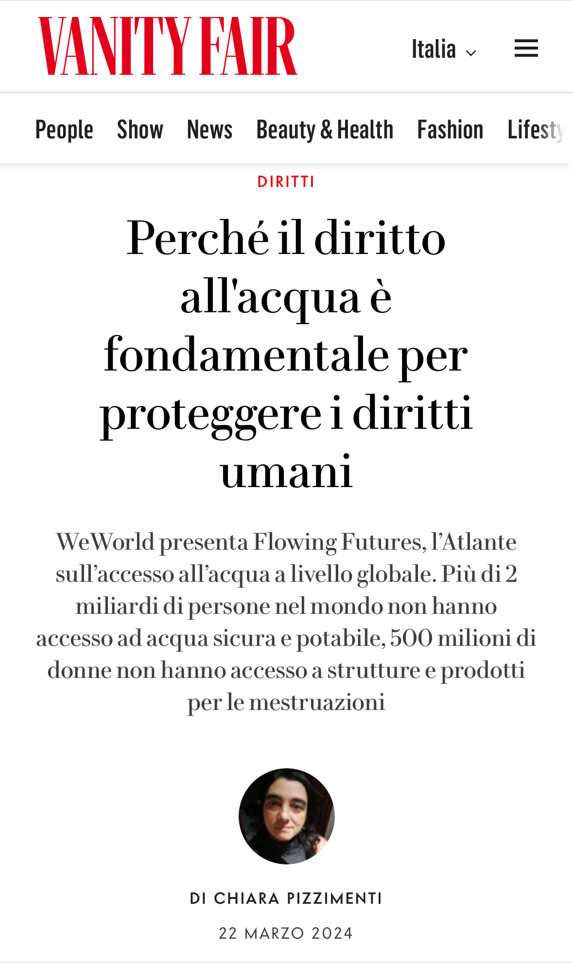 In occasione della giornata mondiale dell’ACQUA che si celebra venerdì 22 marzo, Pianeta2030 del Corriere della Sera ne ha anticipato, con un anteprima, alcuni contenuti, e Vanity Fair, nell’articolo di Chiara Pizzimenti ha sottolineato come e perché ‘il diritto all’acqua è fondamentale per proteggere i diritti umani‘.