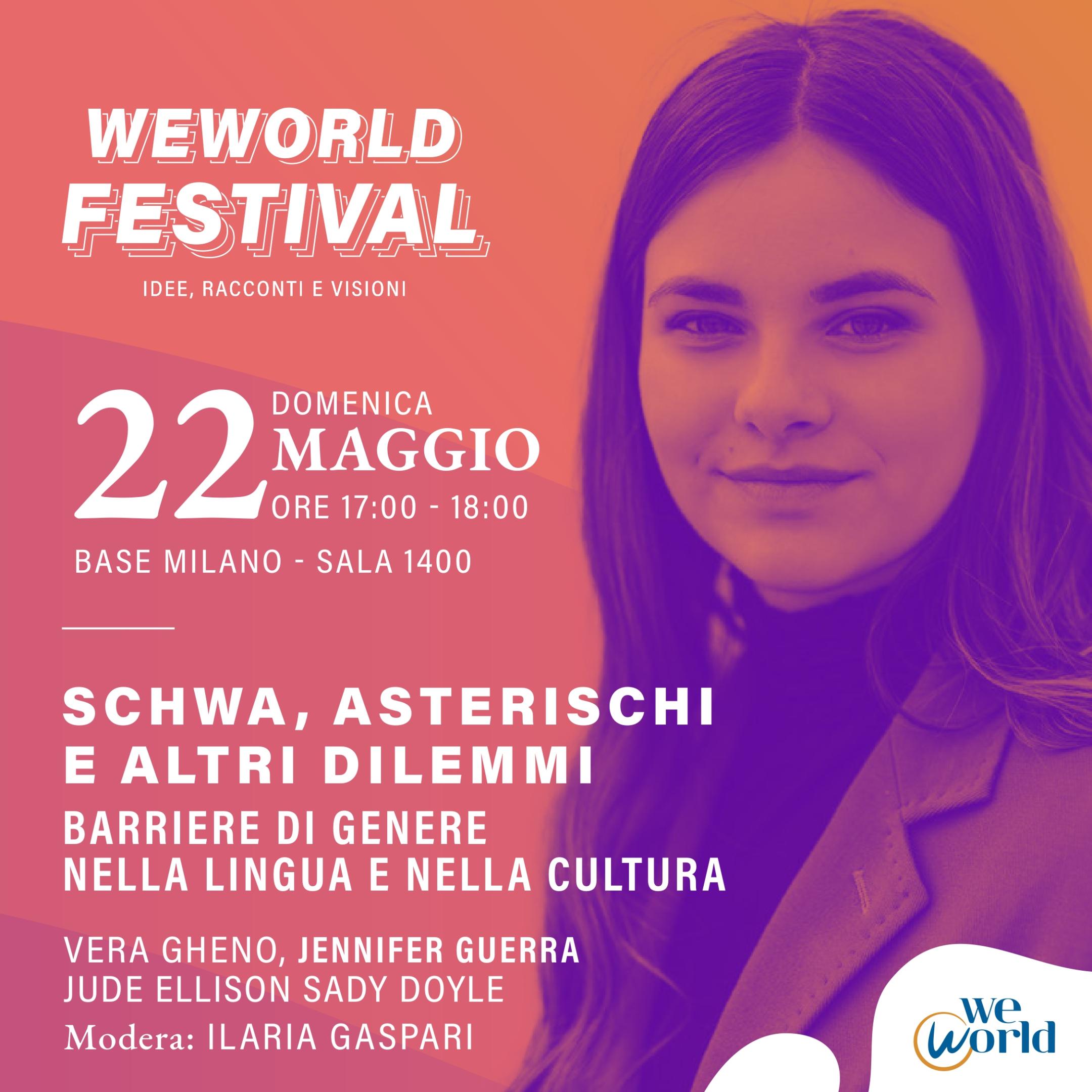 “Schwa, asterischi e altri dilemmi”: la sociolinguista Vera Gheno, la giornalista Jennifer Guerra e l’autore femminista americano Jude Ellison Sady Doyle, in collegamento dagli Usa, moderati dalla filosofa e scrittrice Ilaria Gaspari a confronto sulle barriere di genere nella lingua e nella cultura, argomento molto discusso negli ultimi anni.