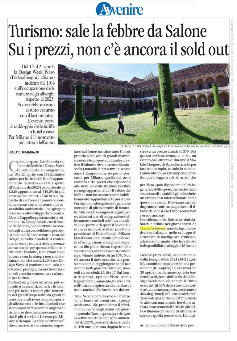 È così anche quest’anno? La start up Maiora Solutions, attraverso il proprio tool di intelligenza artificiale, ha analizzato i prezzi medi per un soggiorno negli hotel, B&B e appartamenti di Milano e la relativa disponibilità. I risultati sono stati confrontati con la settimana precedente e quella successiva alla DesignWeek.