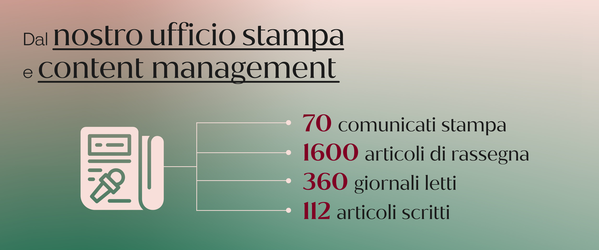 Le attività di ufficio stampa e content management ci hanno dato molto da fare come testimonia la mole importante di comunicati stampa prodotti e articoli usciti su tutta la stampa italiana: nazionale, locale, specializzata, radio e tv. In eos comunica abbiamo deciso sin dall’inizio, di non focalizzarci su un unico settore: un approccio molto eterogeneo e, a nostro avviso vincente, che ci ha permesso negli anni di costruirci un network importante sui media italiani: dalla finanza all’energia, dal real estate all’hospitality, dalla consulenza all’intelligenza artificiale, passando per il food, il fashion e la cooperazione internazionale.