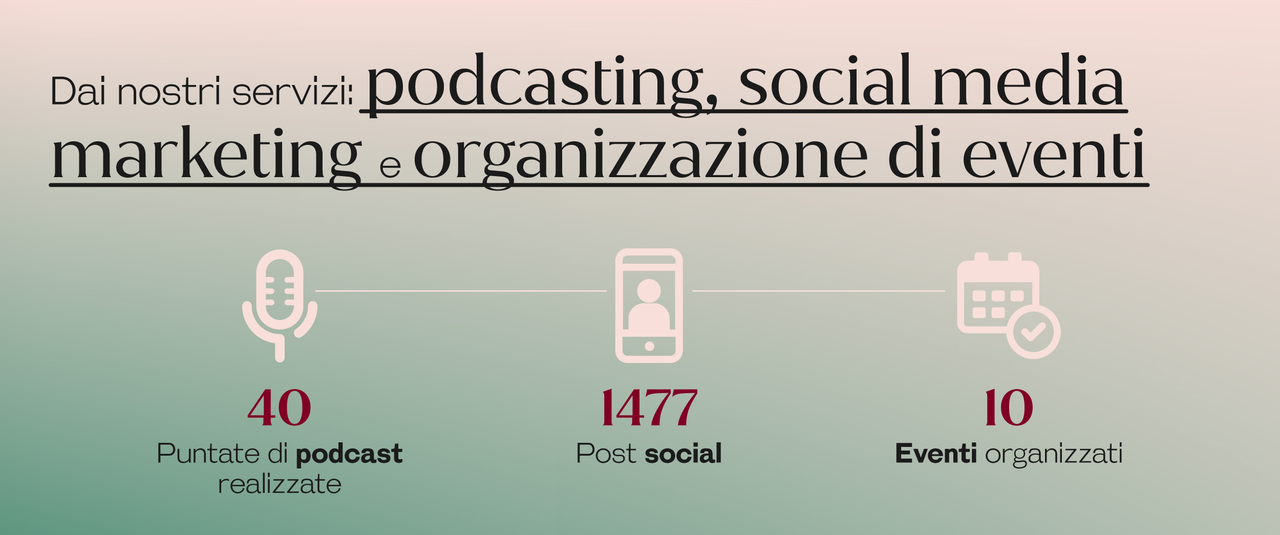 Dalla produzione di piani editoriali mirati su specifiche progetti, all’ideazione e realizzazione di attività creative o compagne pubblicitarie ad hoc, le attività sui social network che curiamo per i nostri clienti non si sono mai fermate così come quelle relative ai podcast, attività che presidiamo ormai da anni in tutte le sue fasi e che ci ha permesso di allargare lo sguardo e mantenere le antenne della nostra curiosità ben sintonizzate sul mondo che ci circonda e su quello che verrà.