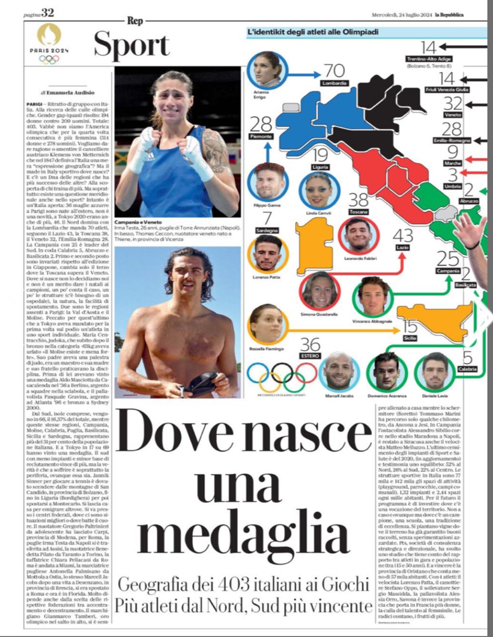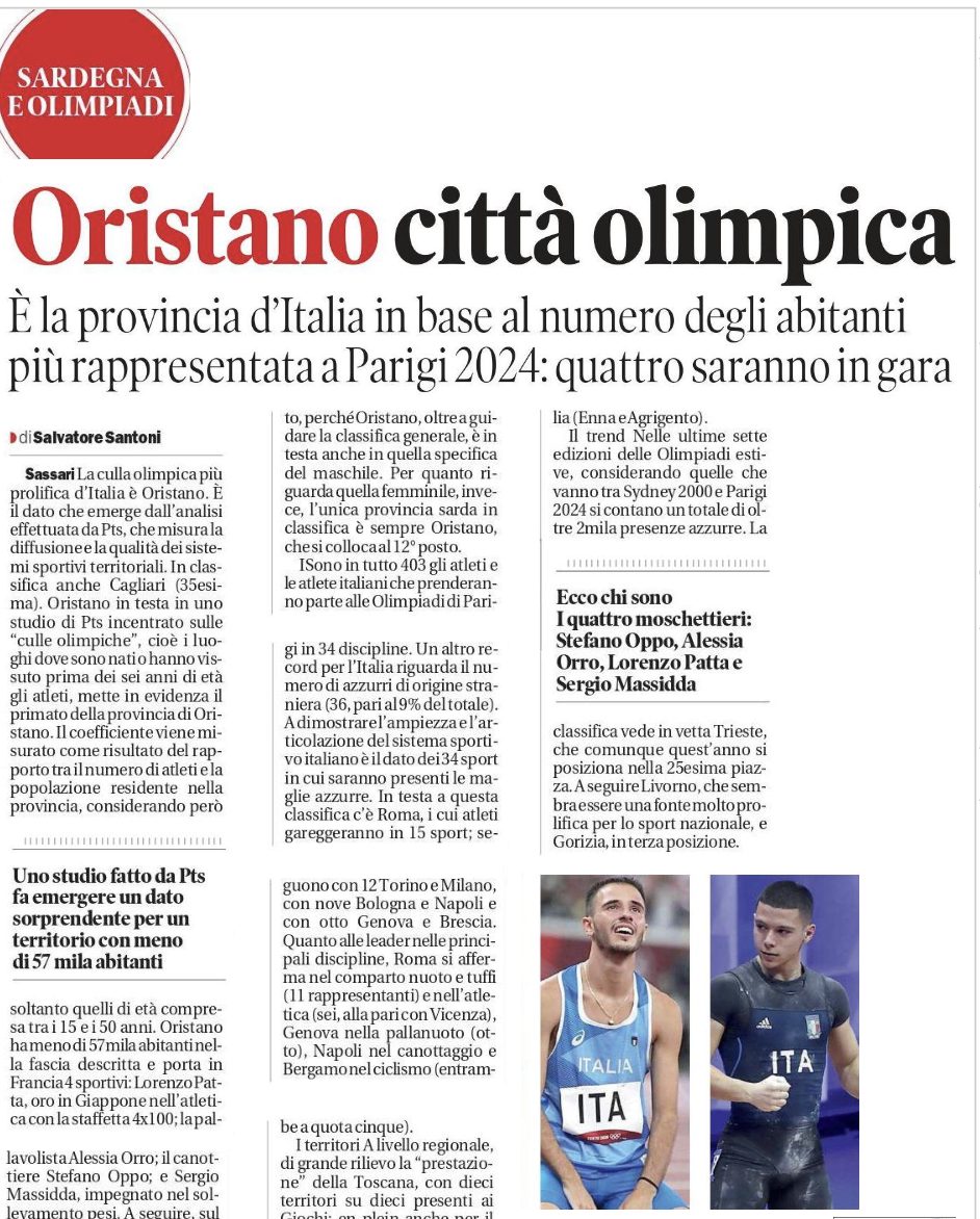 L’indagine mette in relazione, per ogni provincia, il numero degli atleti e delle atlete presenti alle Olimpiadi e la popolazione residente, in un’età compresa tra i 15 e i 50 anni: secondo l’indice elaborato da PTS, il primo posto nel ranking spetta alla provincia di Oristano, che pur avendo meno di 57mila abitanti nella fascia considerata, porta in Francia 4 azzurri.