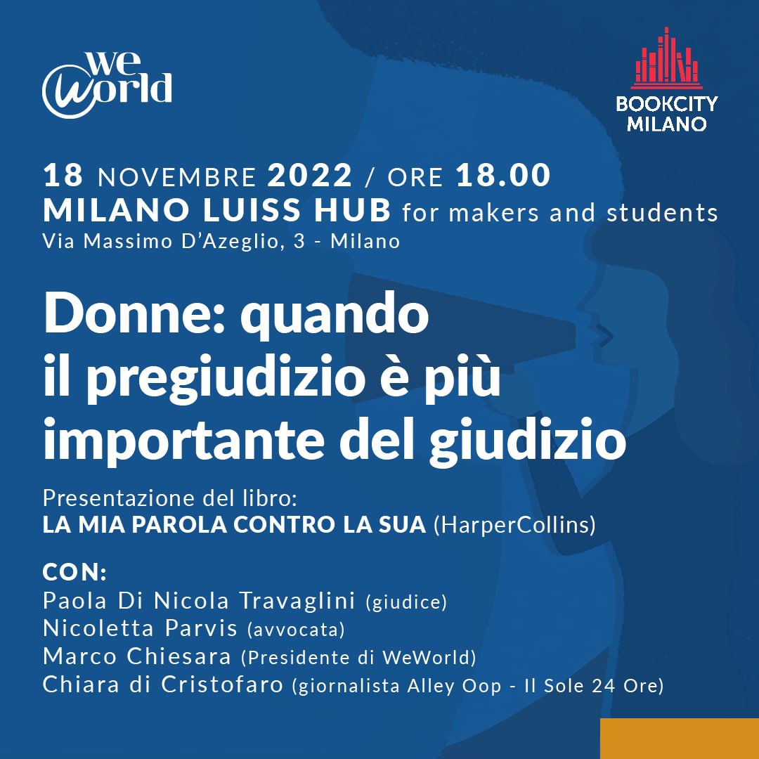 All’incontro partecipano Paola Di Nicola Travaglini (Giudice, consigliera della Corte di Cassazione, e autrice di “La mia parola contro la sua”, HarperCollins editore), l’avvocata Nicoletta Parvis e Marco Chiesara (Presidente di WeWorld).